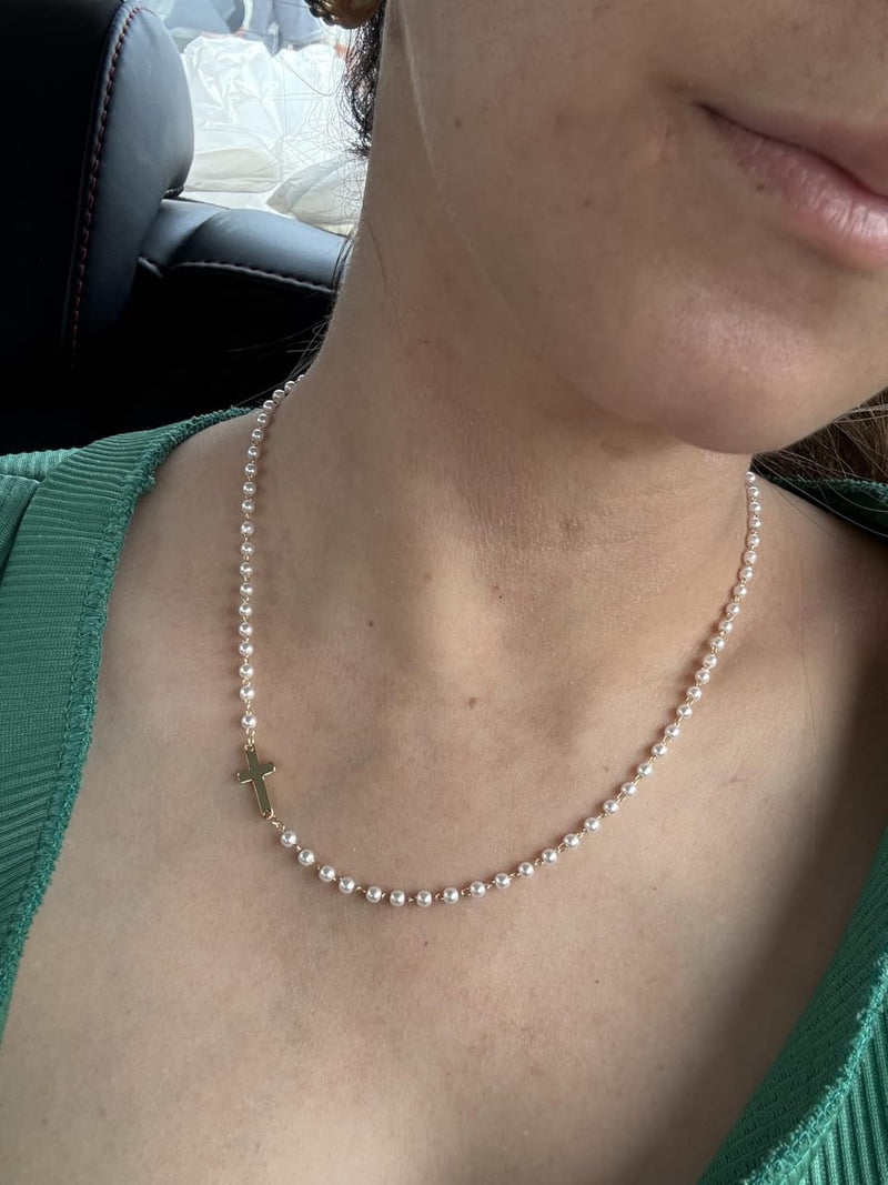 The delicate cross and luminous pearls come together to represent faith, grace, and love a piece that carries more than just beauty.